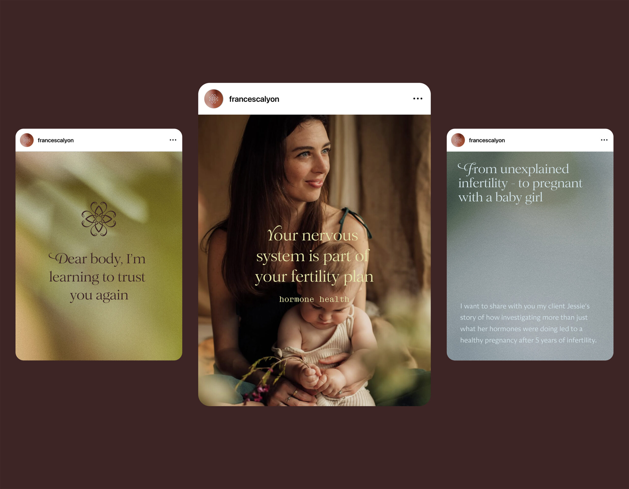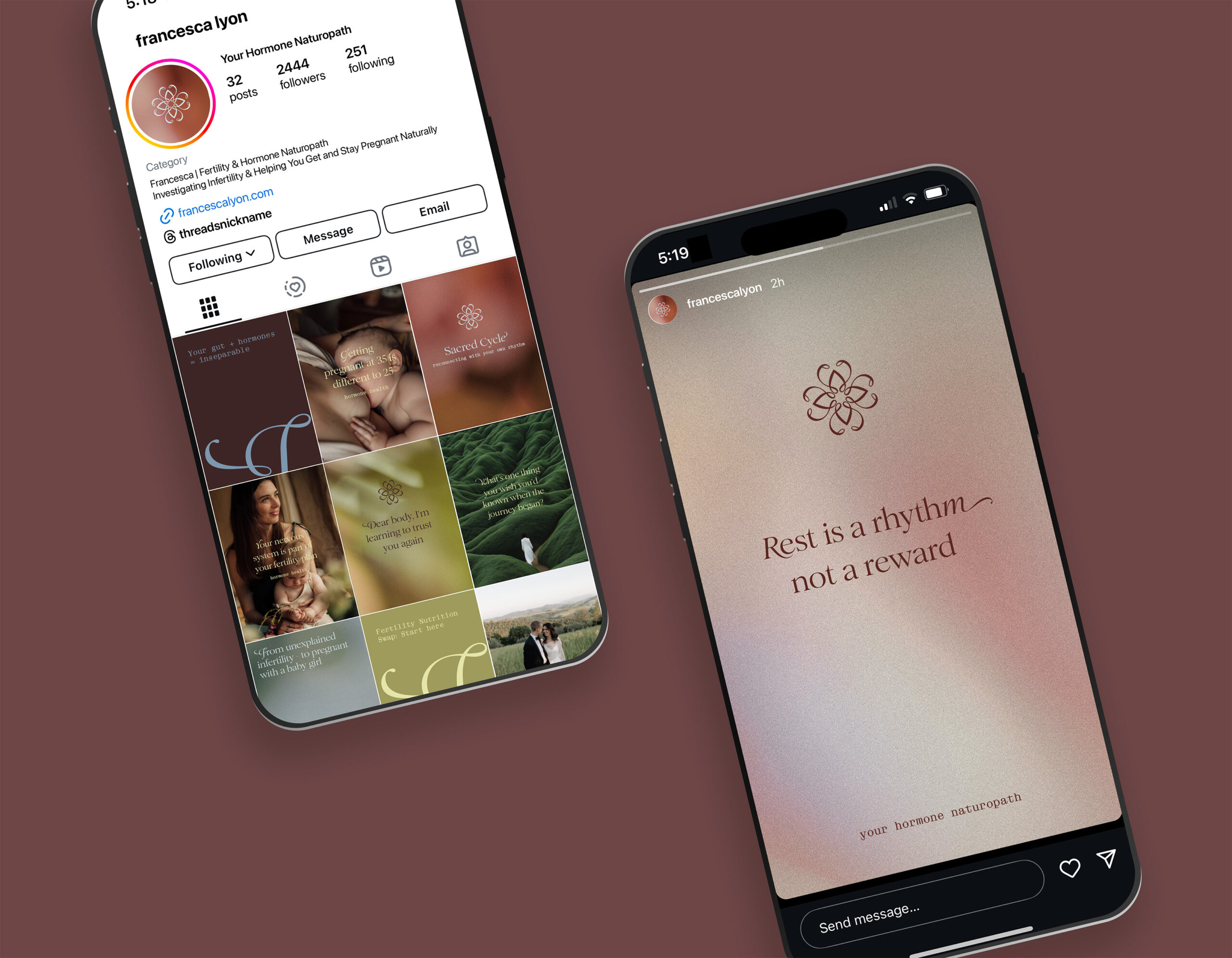 As a naturopath, Francesca supports balance across the hormonal system, as well as the body, mind, and soul. She specializes in hormonal health for women and couples preparing for pregnancy. Her presence is gentle yet professional, natural yet modern—a harmony reflected in her brand design. She weaves together timeless wisdom from the natural world with a contemporary approach to health, creating a truly holistic experience.